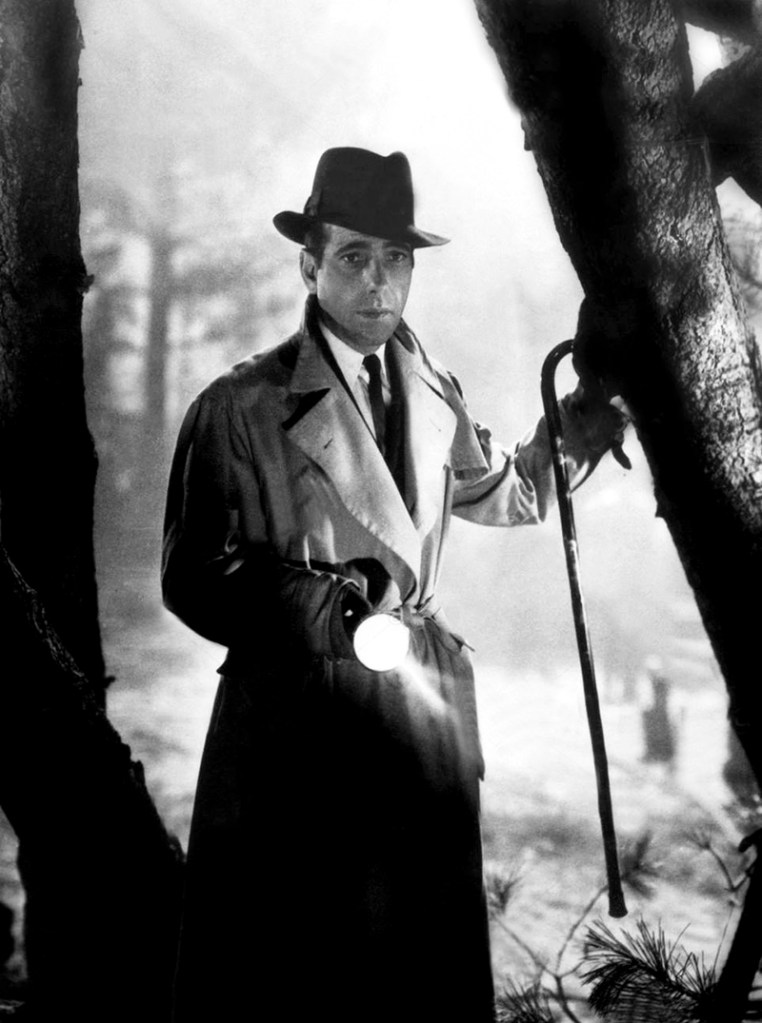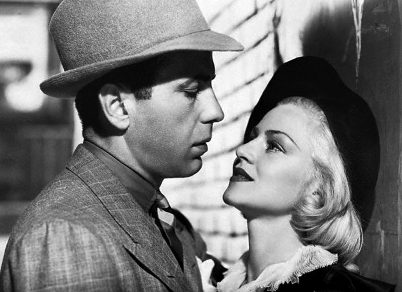 Smoking blanc, œillet à la boutonnière et verre de whisky à la main, dans le cabaret de Casablanca (1942), il égrène des souvenirs douloureux : le film, un des plus populaires au monde, a fait de Humphrey Bogart l’incarnation du romanesque hollywoodien dans ce qu’il a de meilleur. Borsalino sur l’œil, trench-coat serré, Bogart se passe dubitativement le pouce sur la lèvre. Un genre (le film noir), une époque (les années 1940) pourraient se réduire à cette icône.