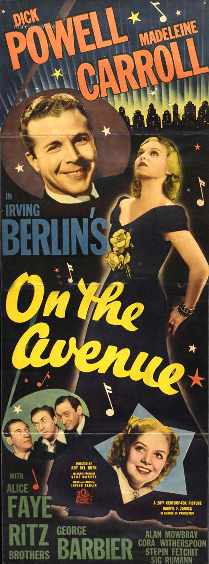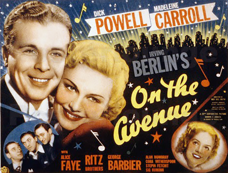Si On the Avenue ne présentait qu’un intérêt, ce serait assurément la brillante partition écrite spécialement pour le film par Irving Berlin. L’une de ses chansons, I’ve Got My Love to Keep Me Warm, est d’ailleurs devenue un grand classique des fêtes de fin d’année aux États-Unis, après avoir été reprise dans les années 1950 et 1960 par des chanteurs aussi importants que Billie Holiday, Ella Fitzgerald et Louis Armstrong (en duo), et Frank Sinatra. Mais la musique est loin d’être le seul atout de cette production de la Fox, qui s’inscrit dans la tradition du « backstage musical » – ces histoires situées dans les coulisses d’un spectacle. Avec son humour qui lorgne parfois vers la comédie loufoque, alors en vogue à Hollywood sous l’impulsion de Frank Capra et Howard Hawks, On the Avenue mêle de façon équilibrée numéros musicaux et démêlés amoureux. Et les aficionados du genre musical remarqueront avec amusement que le principe de départ du film – une belle héritière s’immisce dans un spectacle qui la tourne en dérision – sera repris bien plus tard, avec une inversion des sexes, dans Let’s Make Love (Le Milliardaire), avec Marilyn Monroe et Yves Montand. Un film également produit par la Fox.