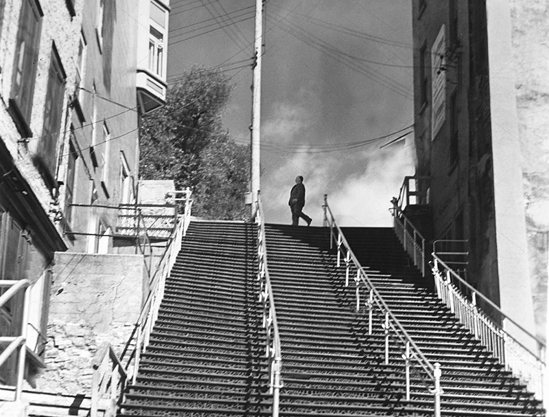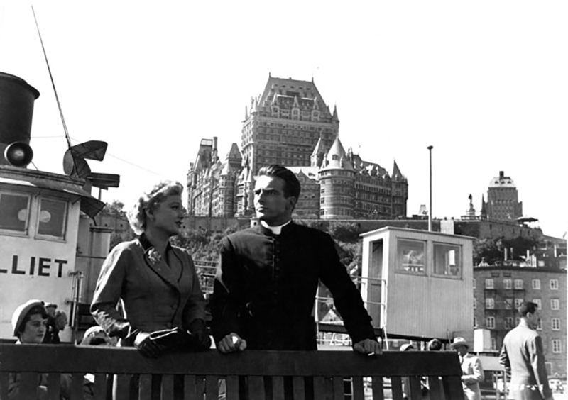 Le 21 août, le premier clap retentissait dans les rues de Québec. L’équipe de tournage ne quitta la ville qu’au début du mois d’octobre : une fois n’est pas coutume, Hitchcock avait décidé de tourner une grande partie de son film en extérieur. Ce mouvement vers le dehors n’était pas anodin. Hitchcock aimait les studios, un espace plus malléable et adaptable aux besoins du film, et il ne quittait pas Hollywood pour réaliser un tournage entièrement en extérieurs sans une bonne raison. On peut penser que cette raison était la ville de Québec elle-même. La cité, si présente dans I Confess, cadre des déambulations du père Logan, impose sa silhouette et son ambiance tout au long du film au point de devenir un personnage à part entière.
