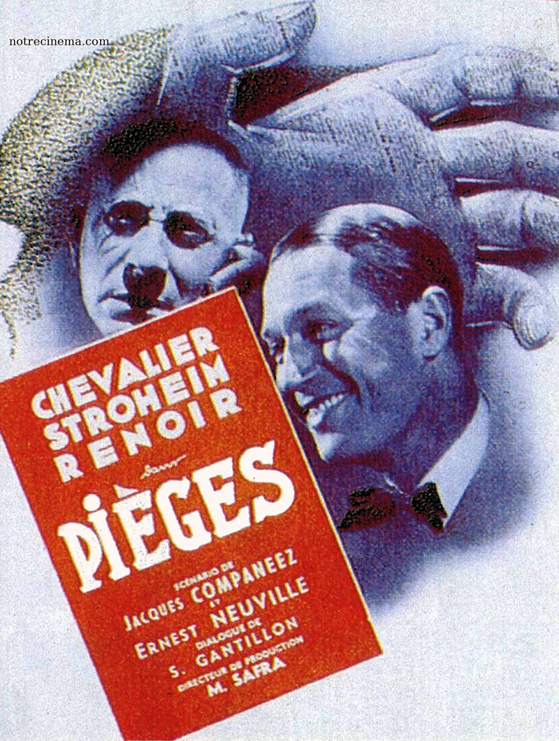 Pour rendre le rôle du « détective féminin », autour duquel pivote le film, plus crédible, Siodmak place aux côtés du chanteur une inconnue de son crû : Marie Déa joue au théâtre Montparnasse où elle vient d’apparaître dans « Madame Bovary » et « Faust » sous la direction de Gaston Baty. En outre, le cinéaste réunit quelques talents qui firent l’énorme succès de L’Alibi (Pierre Chenal) deux ans auparavant : Erich von Stroheim le scénariste d’origine russe Jacques Companeez et l’opérateur américain Ted Pahle. Sous le pseudonyme du co-scénariste Ernest Neuville se cache le berlinois Ernst Neubach, une vieille connaissance de Siodmak puisque l’auteur de Der mann, der seinen mörder sucht. Wakhévitch signe les décors, érigés dans les studios de Joinville-Pathé (avril-mai). Cette collaboration « internationale » suscitera d’ailleurs l’ire de la presse patriotarde : « Un film dans lequel M. Maurice Chevalier s’est laissé tomber. Deux étrangers, M. Siodmak et Companeez, lui ont joué ce mauvais tour », écrira L’Action française. « M. Von Stroheim, Prussien pur sang, devrait être rendu par nous à M. Hitler. N’est-il pas honteux de penser qu’il est payé plus que tout acteur français, qu’il a bien moins de talent que M. Blanchar, Jean Max, etc., etc. qui ont le même emploi et sont de chez nous ? » Du reste, dans certaines localités, les affiches de Pièges, libellées « un film de Companeez et Neuville », ne mentionneront pas le nom suspect de Siodmak !