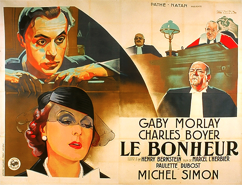 En cette année 1933, Yvonne Printemps quittait Sacha Guitry, Gaby Morlay se brouillait avec Bernstein. Celui-ci, supputant le côté parisien de l’événement, s’empresse d’engager Yvonne pour créer Le Bonheur, se réservant les beaux jours revenus de demander à Gaby d’interpréter à l’écran le rôle de Clara Stuart, l’ex-madame Guitry n’ayant que peu de cote au box-office.Quant à Marcel L’Herbier, le choc du parlant l’avait considérablement meurtri. Outre sa jeunesse, il regrettait les joies alambiquées d’un esthétisme de bonne compagnie. Le tournant fut mal pris car, en dépit de leur charme et de leur éclat, les exploits de Rouletabille n’amusèrent pas tellement L’Herbier. Il se rabattit dès lors sur du théâtre, et du pire : L’Enfant de l’Amour de Bataille, La Route Impériale d’après Frondaie, La Veille d’Armes de Lucien Népoty, L’Aventurier de Capus, et, bien sûr, Le Bonheur qui nous occupe.