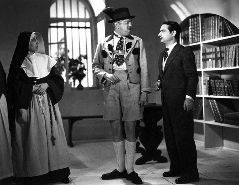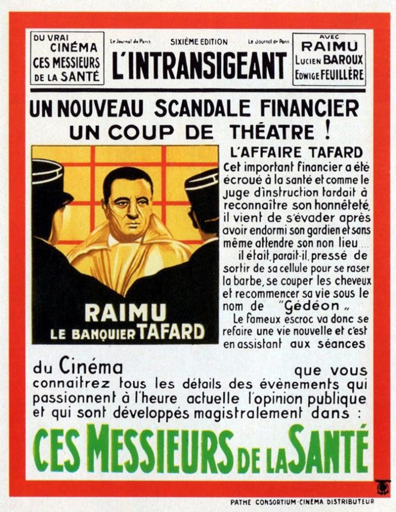 C’est en se replaçant dans ce climat qu’il faut voir Ces Messieurs de la Santé: la petite bourgeoisie française (qui consommait massivement les films de Pierre Colombier : il en a tourné plus de vingt entre 1930 et 1939 !) se venge à sa manière, en brocardant l’argent avec une hargne pas toujours saine. On ne sait pas très bien s’il faut admirer ou mépriser l’astuce de ce Gédéon interprété en force par Raimu. S’il faut voir dénonciation ou complaisance dans les allusions à un antisémitisme qui ne se pratiquait pas seulement de l’autre côté du pont de Kehl (Raimu s’adresse à la Banque Samuel et Duguesclin, et plus précisément à Duguesclin : « Allo, comment vas-tu, Salomon? »). La résistible ascension de Monsieur Gédéon, qui entre deux séjours à la Santé, en vient à vendre des mitrailleuses dans un magasin de corsets, c’est bien le cinéma de l’air du temps, dans ce que les années 1930 ont eu de moins sympathique – le temps de cette presse à l’énorme tirage qui expliquait aux Français que s’ils vivaient plus mal, c’était la faute à la fois aux « tribus juives » et aux inutiles du « Palais Bourbeux ». [Jean-Pierre Jeancolas – Les Français et leur cinéma (1930-1949) – Deuxième cinécure (en collaboration avec la Cinémathèque de Toulouse )- Maison de la Culture de Créteil – Eric Losfeld (1973)]