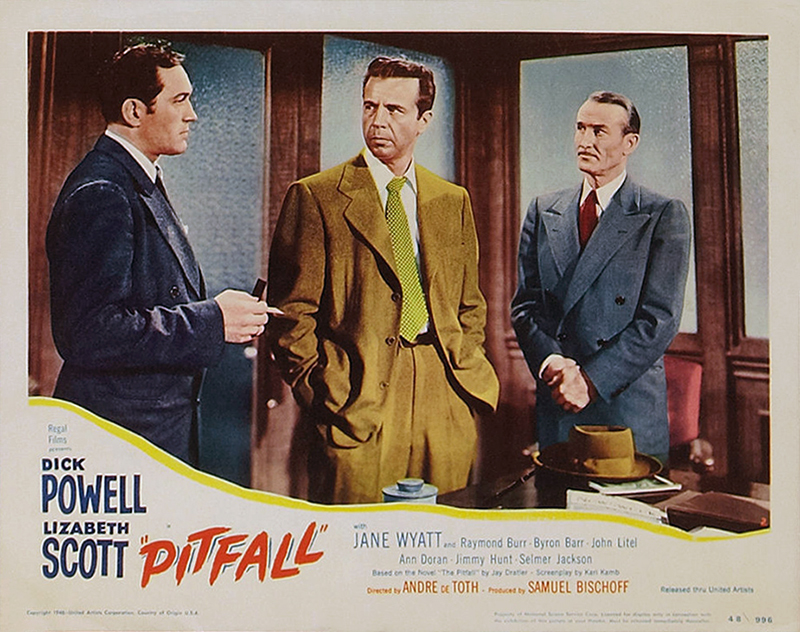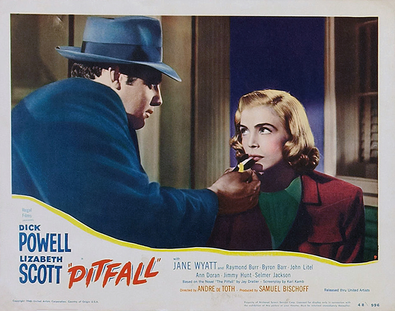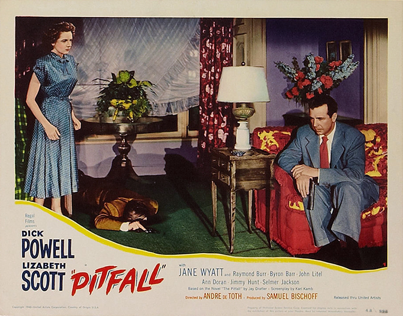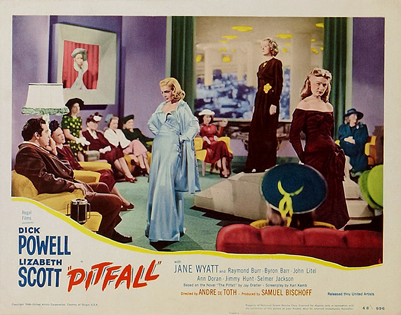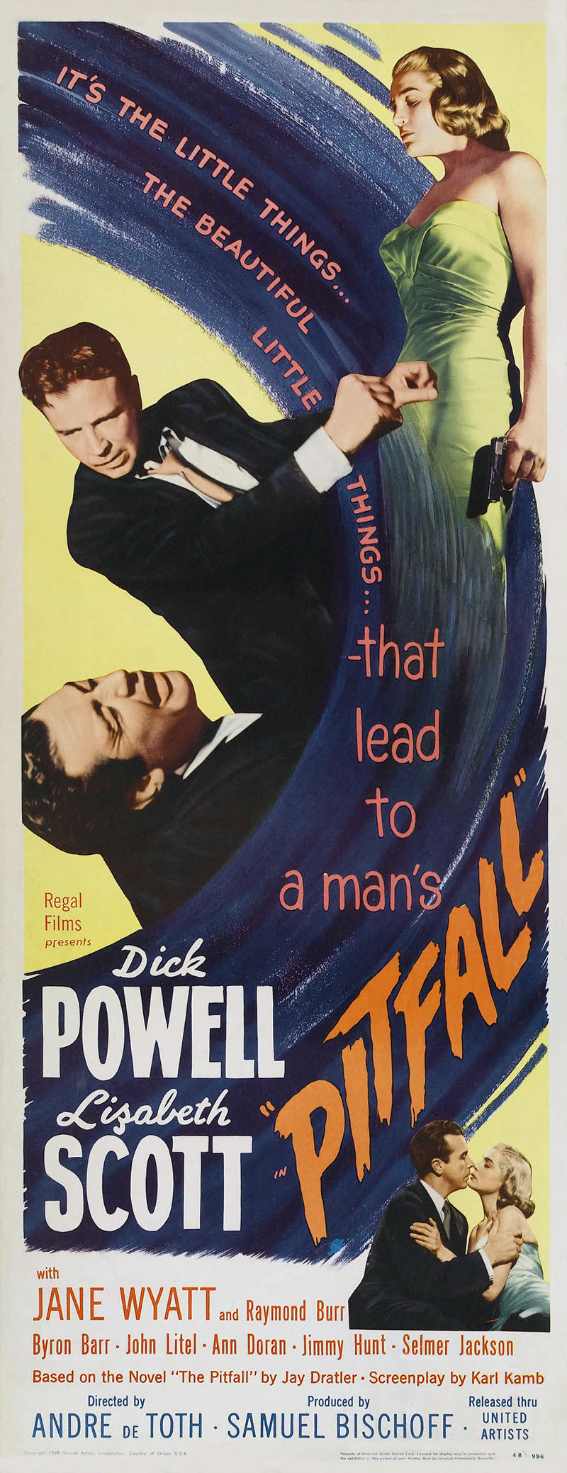 Pitfall est le film noir clé sur le thème du mari volage perdant sa respectabilité bourgeoise. La distribution est pertinente : Raymond Burr, dans le rôle de Mack, est à la fois répréhensible et pathétique lorsqu’il essaye de se faire aimer de Mona, jouée par Lizabeth Scott, prototype de la femme fatale au grand cœur qu’Humphrey Bogart a décrite comme « une Cendrillon à la voix rauque » (Dead Reckoning).