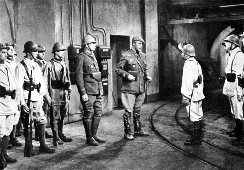 Au début de Sommes-nous défendus ?, un long métrage de Jean Loubignac qui connut une grande diffusion dans l’hiver 1938-39, un journaliste interprété par René Lefèvre nous dit : « La France peut fermer ses portes et boucler ses verrous de sûreté ». Suit une séquence de reportage sur la Ligne Maginot (dont on trouve un écho dans le premier volet de Français si vous saviez de Harris et de Sédouy). Il est difficile d’imaginer aujourd’hui la popularité presque mythologique que la presse avait su faire naître autour de ces forteresses enterrées entre le Rhin et la Meuse. Comme il est difficile d’imaginer la place que tenait dans le corps social l’institution militaire : l’armée avec ses formes (ses uniformes), ses rites, ses chefs, ses lieux… Le cinéma « militaire » fut un grand genre de cette décennie : jusqu’à 1939, brocardés (sans méchanceté : il n’est pas en France de cinéma antimilitariste) ou auréolés de la gloire des Trois de Saint-Cyr, les officiers tiennent l’écran comme une province conquise…