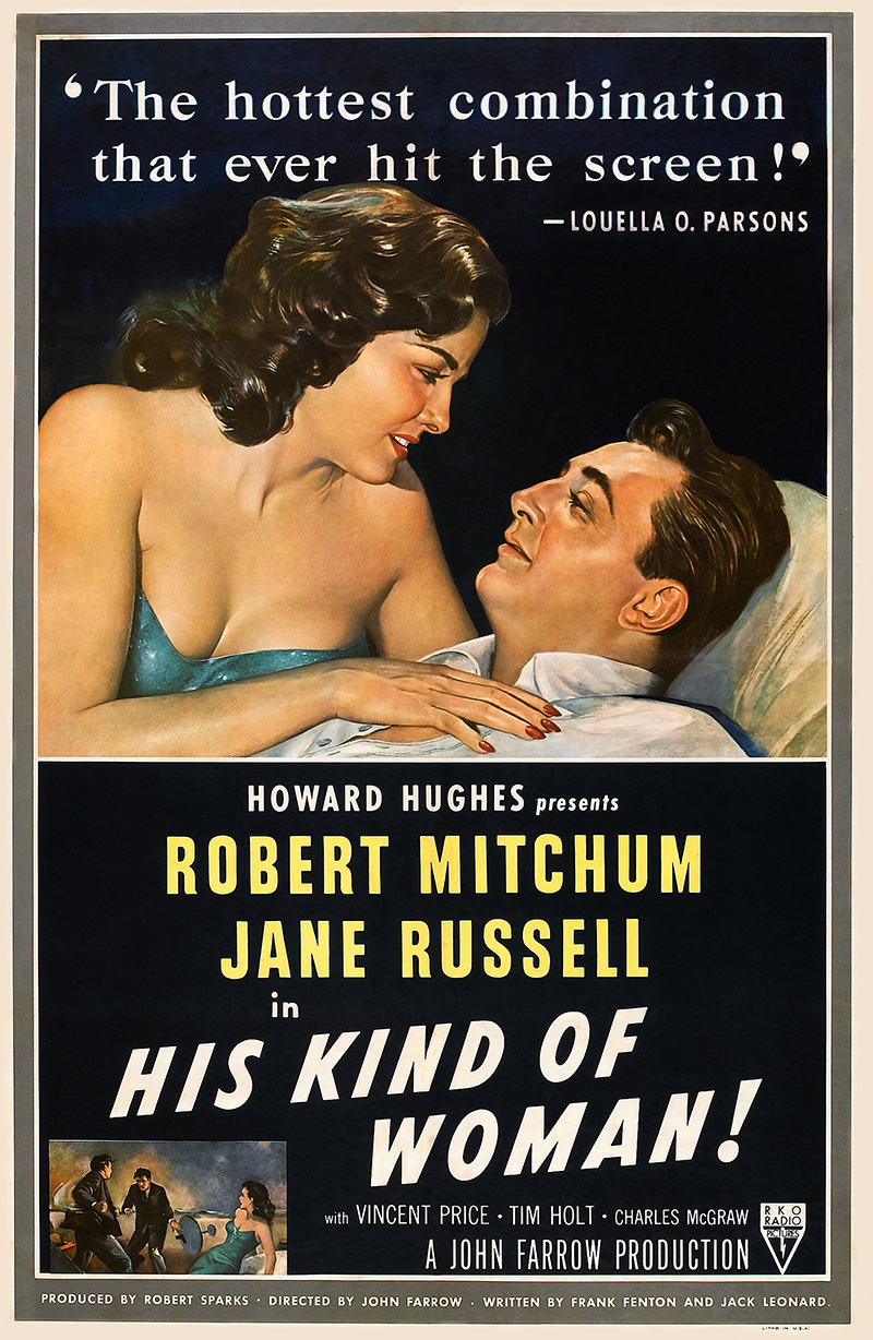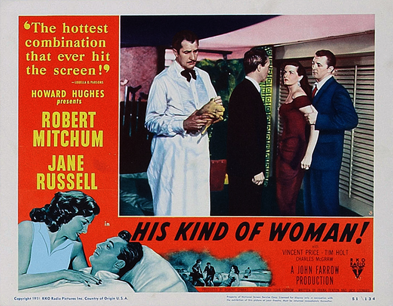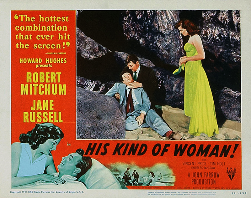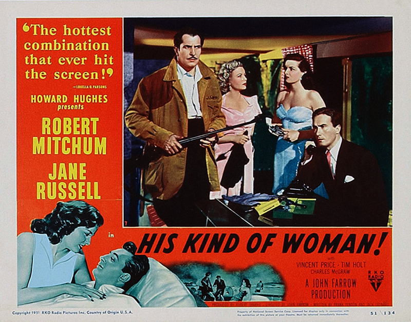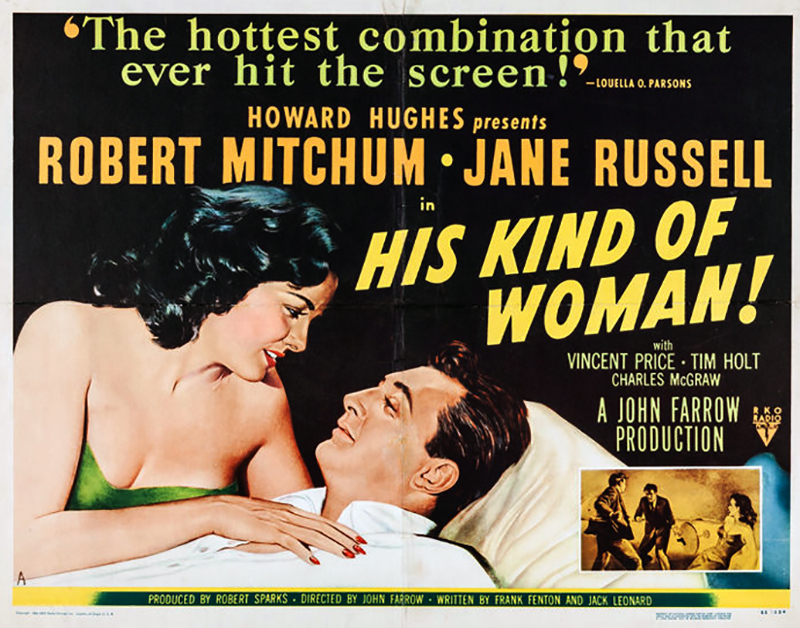 Il fallut notamment reconstruire complètement le yacht en studio pour la séquence finale, mais aussi retourner une bonne partie des scènes puisque Hughes avait imposé un nouvel acteur pour interpréter Ferraro, le mafieux, l’acteur Raymond Burr. Mitchum prit à cette occasion la mauvaise habitude de s’enivrer pour passer le temps et la légende raconte que un jour, sous le coup d’une violente colère, il détruisit intégralement le décor où était tourné les dernières scènes du film. His Kind of Woman, sorti en 1951, est un film composite avec une ouverture sur le registre du film noir qui bifurque ensuite sur le ton de la comédie vers le divertissement haut de gamme.