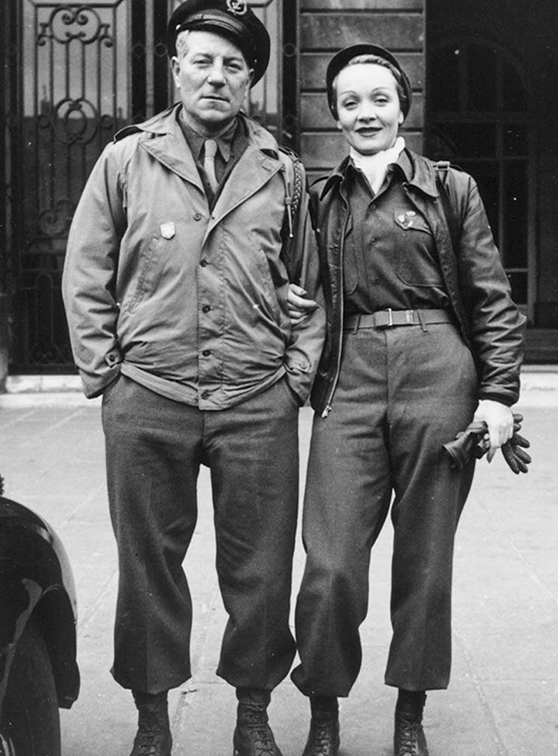 Mais Gabin, hyperactif de nature, s’ennuie terriblement à Los Angeles. Alors que Marlene passe ses journées à travailler, il ne retrouve quant à lui le chemin des studios qu’en 1942, pour Moontide (La Péniche de l’amour). En outre, il ne cesse de penser à la guerre qui ravage l’Europe. S’il tourne The Impostor (L’Imposteur), un film de propagande gaulliste, ce n’est pas suffisant à ses yeux. En 1943, Gabin décide donc de rejoindre les Forces Françaises Libres. Marlene ne le retient pas : elle ne tardera d’ailleurs pas à s’engager à son tour. Séparés pendant de longs mois, Gabin et Marlene se retrouvent à Alger, où le « second maître Moncorgé », est un peu gêné d’être vu le soir en compagnie d’une star planétaire… Puis Gabin s’en va combattre en France et en Allemagne, tandis que Marlene gagne l’Italie, où elle échappe de peu à l’armée hitlérienne. Leurs retrouvailles, en mai 1945, sont restées célèbres : devant toute la division Leclerc alignée pour la venue du Général de Gaulle, Marlene surgit soudain et grimpe sur le char de son amant pour l’embrasser. Au grand dam de Gabin, qui aurait préféré plus de discrétion…
