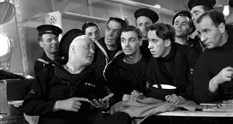 La guerre va encore renforcer cette solidarité. Comme tout le cinéma anglais de cette époque, la Ealing va soutenir l’effort de guerre en exaltant la force de caractère et la combativité britanniques. « Du spectaculaire et de l’authenticité », tel sera le slogan publicitaire de Convoy (1940). Ce drame bien construit ayant pour cadre un navire de guerre connaîtra un grand succès, encore que le spectacle l’emporte certainement sur l’authenticité. Néanmoins, le film a été tourné en décors naturels et le réalisateur Pen Tennyson (qui trouvera la mort l’année suivante dans une catastrophe aérienne) a impressionné à cette occasion une telle quantité de pellicule que les réalisateurs de la Ealing s’en serviront abondamment pour enrichir leurs propres films. Mais les personnages de Convoy sont malheureusement beaucoup moins authentiques que les décors : les officiers en grand uniforme paradent sur le pont, avec leurs jumelles bien astiquées, tandis que les sans-grade obscurs accomplissent toutes les basses besognes, pelletant le charbon et gardant respectueusement leurs distances.