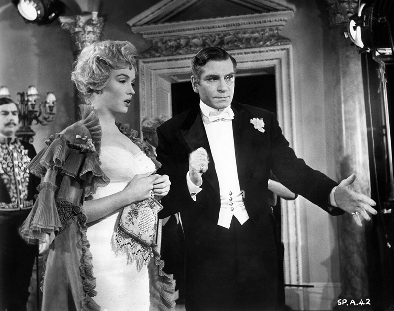 THE PRINCE AND THE SHOWGIRL (Le Prince et la danseuse) – Laurence Olivier (1957). C’est une nouvelle tentative malheureuse de s’évader de la « vulgarité » hollywoodienne de série, et Marilyn, productrice, ne parvient cette fois à lui opposer que la version britannique de l’intellectualisme factice et des traditions théâtrales les plus élimées. Encore parvient-elle en toute fantaisie à tirer son épingle du jeu, par une vivacité et une spontanéité devant lesquelles le métier de son partenaire s’empèse à vue d’œil. Malgré cela, cette histoire de danseuse américaine amoureuse d’un prince d’Europe centrale en visite à Londres, sombre vite dans l’ennui raffiné automatisé et royaliste où son metteur en scène la conduit infailliblement.