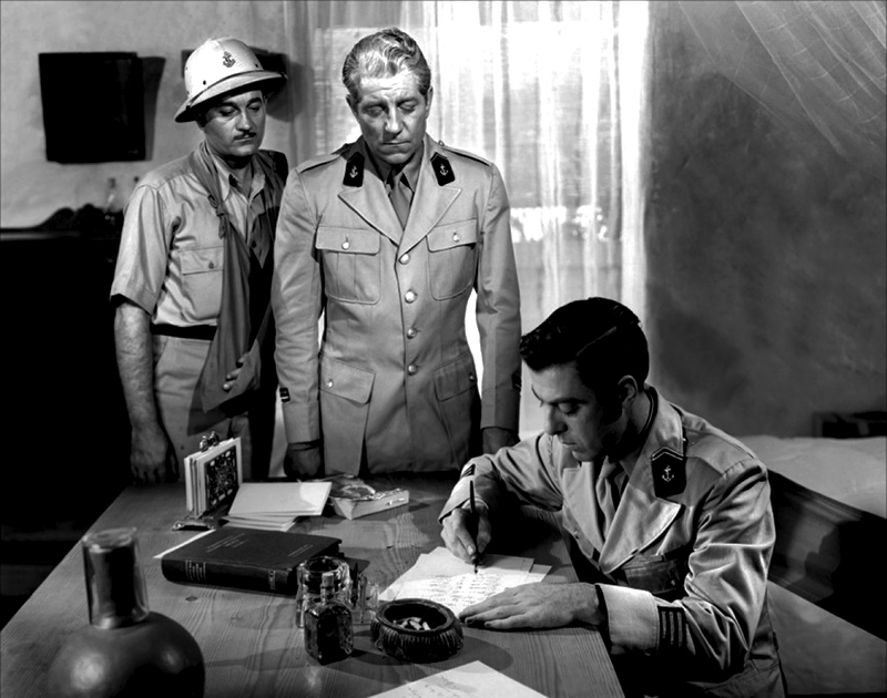 Cette fuite de soi-même ne trouve son issue que dans la mort, une mort héroïque prenant valeur de rédemption. Dans cette fin comme dans tout le film, court, on l’a dit, le souvenir de La Bandera, par le sujet et la présence de Gabin, mais aussi par la nostalgie de la France en terre africaine (omniprésente, aussi, dans Pépé le Moko) et jusqu’à certains personnages, tel Monge (John Qualen), équivalent de Mulot (Aimos). Comme dans le film de 1935, les souvenirs (de Normandie, cette fois) que celui-ci a besoin d’évoquer s’opposent au refus de Clément de se retourner vers un passé qui dissimule son secret : « Je n’ai pas de souvenirs », tente-t-il de se convaincre, tout comme il interrompra, plus tard, le flot d’évocations nostalgiques de chacun des soldats par une furieuse exclamation : « Le passé est mort et enterré ! ». Cette scène, où l’un se remémore la pluie en Normandie, un autre Lyon, un troisième Paris et « l’agitation des rues, la foule des passants, les cinémas, les filles », prend d’ailleurs des accents poignants lorsqu’on sait le mal du pays qui rongeait alors Duvivier.