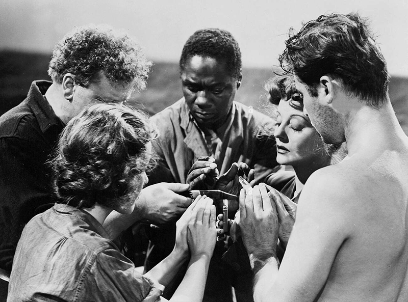 A. H. Oui. Ce qui a rendu les critiques américains si véhéments contre ce film est que j’avais montré un Allemand supérieur aux autres personnages. Or, pendant cette période de 1940-1941, les Français étaient vaincus et les alliés étaient en décomposition. Par ailleurs l’Allemand qui, au début, se faisait passer pour un simple marin, avait été commandant de sous-marin ; il y avait donc toutes les raisons de penser qu’il était plus qualifié que les autres pour prendre le commandement du canot, mais apparemment les critiques ont pensé qu’un méchant nazi ne pouvait être un bon marin ! Le film a tout de même obtenu un certain succès à New York, mais il n’était pas très commercial, ne serait-ce qu’à cause du défi technique. Je n’ai jamais laissé la caméra sortir du bateau, je n’ai jamais montré le bateau vu de l’extérieur et, de plus, il n’y avait pas une note de musique, c’était très rigoureux. Evidemment, l’ensemble a été dominé par le personnage de Tallulah Bankhead.