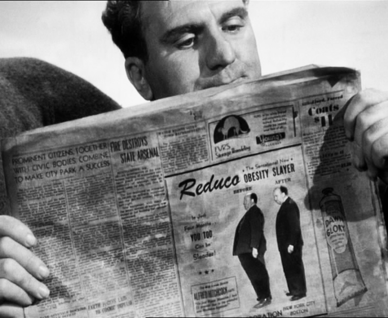 A. H. C’est mon rôle favori et je dois avouer que j’ai passé de longs et pénibles moments à résoudre ce problème…D’habitude je joue un passant, mais comment inventer des passants sur l’océan ! J’avais bien pensé figurer un cadavre flottant à distance du bateau de sauvetage, mais j’avais trop peur de me noyer. Et il m’était impossible de jouer l’un des neuf survivants, car tous ces rôles devaient être tenus par des actrices et des acteurs compétents. Finalement, je suis tombé sur une excellente idée. Je suivais à ce moment-là un régime très sévère, allant péniblement vers mon but qui était de perdre cinquante kilos en descendant de cent cinquante à cent. Ainsi, je décidai d’immortaliser mon amaigrissement et d’obtenir en même temps mon bout de rôle en posant pour des photographies « avant » et « après » la cure d’amaigrissement. Ces photos furent reproduites comme illustrant une publicité dans le journal, prônant une drogue imaginaire « Reduco » – et les spectateurs pouvaient voir aussi bien cette annonce que ma propre personne, lorsque William Bendix dépliait un vieux journal que nous avions accroché au bateau. Ce rôle fut un grand succès !