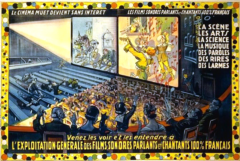 Les grandes sociétés cinématographiques se trouvaient donc confrontées à ce double problème : retrouver la faveur du public et affronter la menace que le sonore faisait peser sur leurs intérêts. En effet, comme nous le verrons par la suite, le sonore frappa de plein fouet les grands studios cinématographiques trop investis dans la production de films muets ; c’est ainsi que de véritables montagnes de pellicule s’entassaient dans leurs dépôts, ayant peu de chance d’être distribuées. Le sonore entraîna en outre la disparition des écrans de quantité d’acteurs ; en l’occurrence ceux dont le talent relevait trop exclusivement de la pantomime.