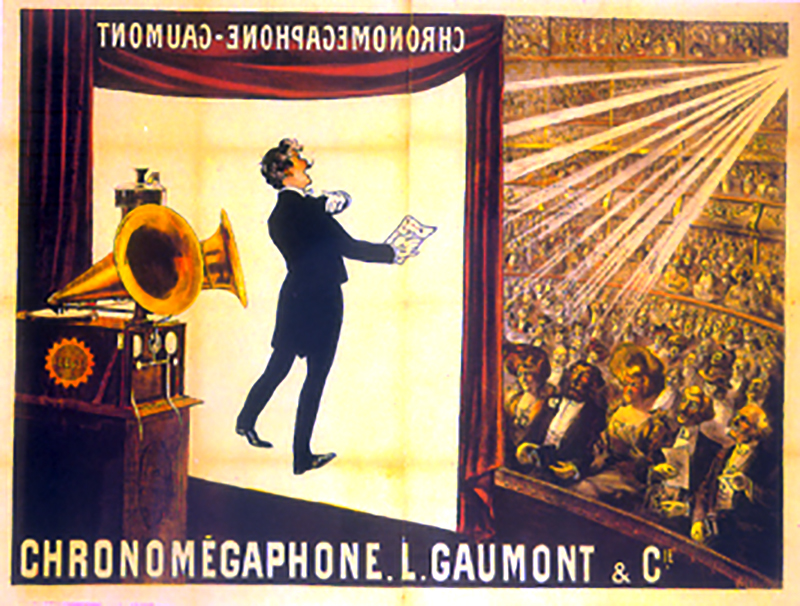En 1898, le Français Auguste Baron (1855- 1938) avait fait breveter le « Graphonoscope », système de synchronisation entre phonographe et projecteur. En 1900, à l’Exposition universelle de Paris, plusieurs systèmes furent présentés. Le plus remarqué figurait dans la vitrine de Léon Gaumont ; c’était le « Phono-Cinéma-Théâtre » mis au point par Clément Maurice et qui permettait une synchronisation manuelle entre un phonographe à cylindre et un projecteur. Quelques petits films, parlés ou chantés par de célèbres acteurs du monde théâtral (Sarah Bernhardt, Coquelin aîné, Polin, Cléo de Mérode, etc.), furent projetés au public de l’Exposition. Ils ne duraient pas plus de une minute.