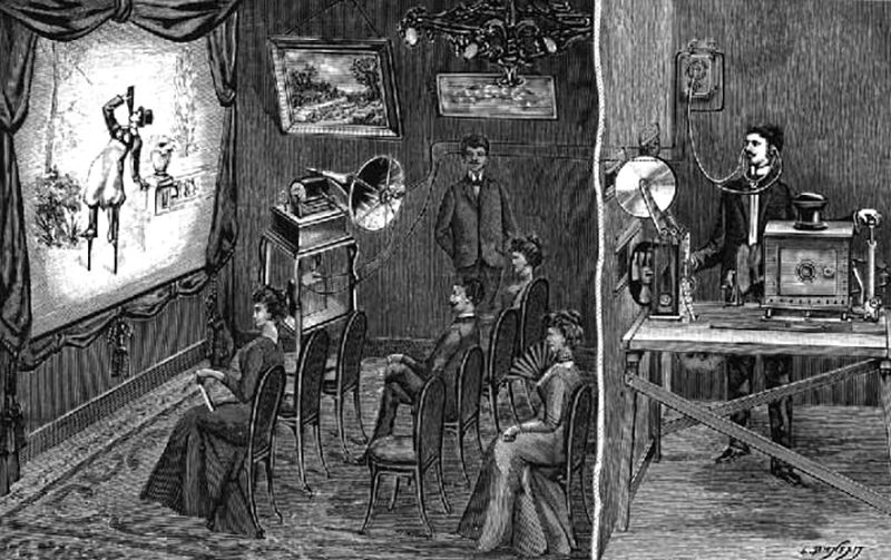 Le cinéma avait plus de trente ans quand il commença à parler : voilà qui peut paraître surprenant si l’on songe que Thomas A. Edison, en 1885, avait déjà eu l’idée d’utiliser ses appareils sonores pour accompagner des images en mouvement. Après quelques années de recherches et d’expérimentation, il réussit à mettre au point le cinétophone, un appareil dérivant de ses deux précédentes inventions : le phonographe et le kinétoscope. Ce dernier était une visionneuse munie d’une petite fenêtre qui permettait au spectateur d’assister à un court spectacle d’images en mouvement. Le cinétophone, cependant, ne fut pas un succès, car Edison ne parvint pas à synchroniser le son et l’image.
