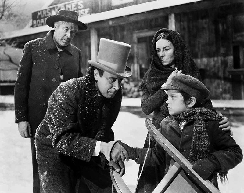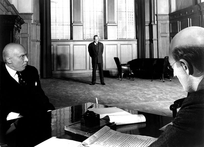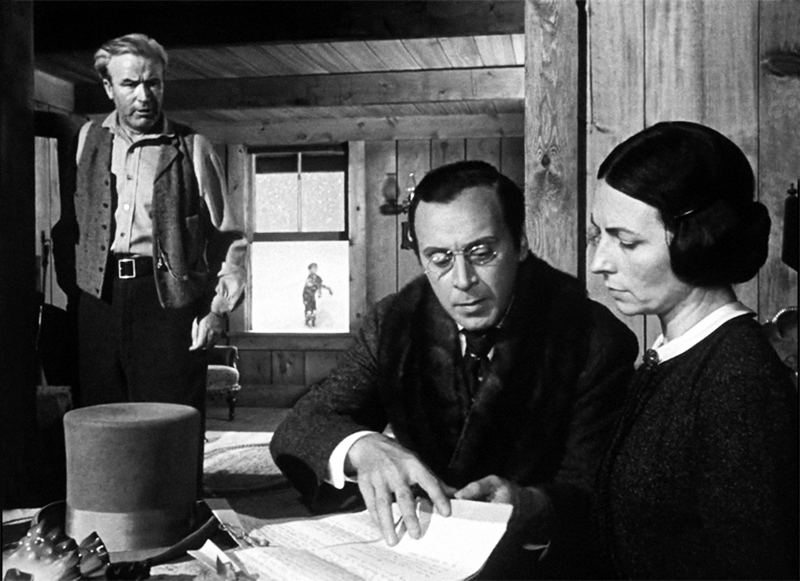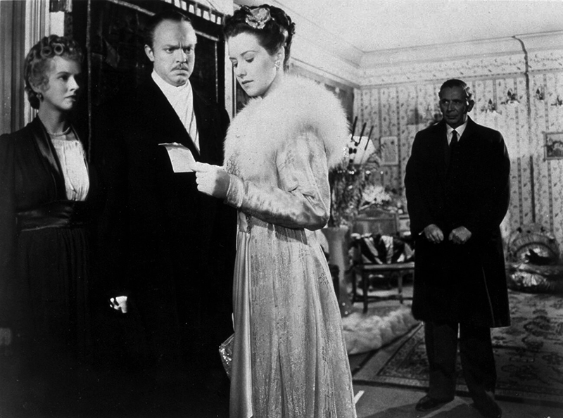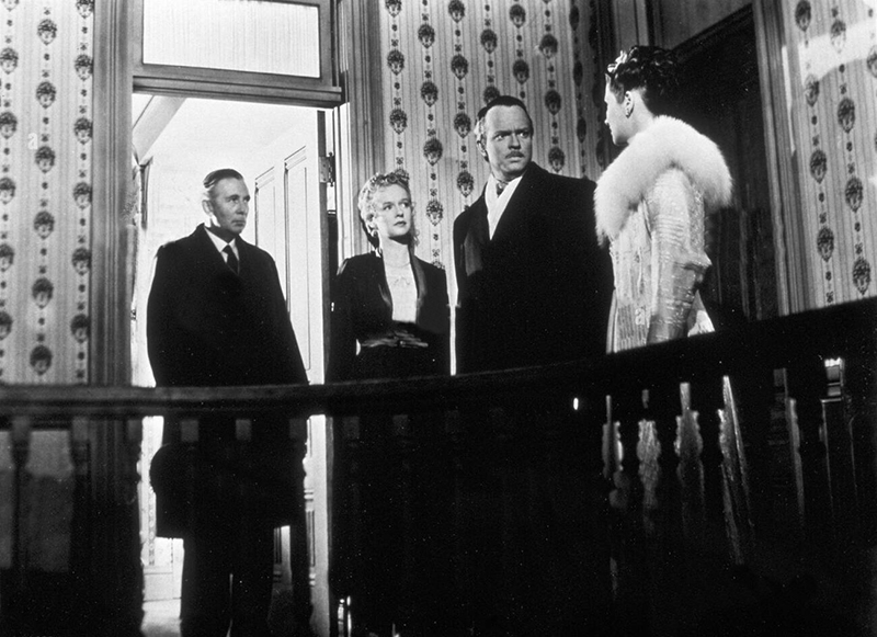 C’est ainsi que le personnage de Kane prend corps non seulement par ce qu’il dit, ce qu’il fait, mais encore et surtout par la façon dont il est introduit dans l’action. Au début du film, il y a une scène où l’on voit Walter Thatcher arriver dans le Colorado pour emmener avec lui le petit Kane. Sur l’un des photogrammes, Madame Kane est assise au premier plan en train de lire les documents relatifs à l’héritage qui échoit au petit garçon. Thatcher est assis à sa droite, légèrement en retrait, tandis que le père de Kane apparaît, debout, sur la gauche. Par la position respective qu’ils occupent, et leur taille, ces trois personnages – tant au point dramatique que visuel – nous semblent être le centre de la scène. Ils occupent objectivement tout l’écran, madame Kane, qui entend agir dans l’intérêt de son fils, est la figure dominante. Pourtant, si notre regard parcourt ce premier plan en diagonale, il est presque aussitôt retenu par un autre élément du plan : la fenêtre au fond de la pièce. Au-delà de l’ouverture, on devine en effet, à travers la neige qui tombe, la silhouette d’un enfant. Un observateur superficiel concluerait que l’enfant est l’élément le moins important de la composition alors qu’en fait il en est l’élément principal. La signification dramatique de cette scène est beaucoup plus évidente si l’on examine le photogramme dans le sens inverse, C’est-à-dire en partant du fond du décor pour arriver au premier plan. La figure la plus petite devient le centre de la scène : c’est de l’avenir de Kane que ses parents et Thatcher sont en train de décider, c’est sa « vie » qui, dès cet instant, va se trouver irrémédiablement changée.