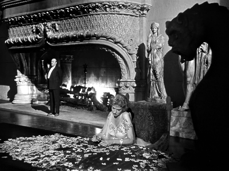 Je ne serai pas capable de dire si l’œuvre de Welles est puritaine car de connais mal la signification de ce mot en Amérique mais j’ai toujours été frappé par sa chasteté ; la dégringolade de Kane est provoquée par un scandale sexuel : « Candidate Kane found in love nest with « Singer » » et pourtant nous avons bien vu que les relations Kane-Susan sont du genre père-fille, des relations protectives. Cette liaison, si toutefois on peut l’appeler ainsi, est justement rattachée à l’enfance de Kane et à l’idée de famille puisque c’est en revenant d’un pèlerinage – il a été revoir les meubles de ses parents dont probablement le traîneau Rosebud, entreposés dans un hangar – qu’il rencontre Susan sur un trottoir. Elle sort d’une pharmacie et se tient la mâchoire car elle a mal aux dents. Lui, vient justement de se faire éclabousser par une voiture. Remarquons que, plus tard, Kane prononcera deux fois le mot Rosebud, en mourant évidemment mais une fois auparavant, lorsque Susan le quitte. Il casse tous les meubles de sa chambre, cette scène est bien connue, mais a-t-on remarqué que la colère de Kane ne s’apaise que lorsqu’il prend en main la boule de verre ? Alors, il est bien clair que Rosebud, déjà lié à l’arrachement maternel, le sera désormais à son abandon par Susan. Il y a des départs qui sont comme des morts.