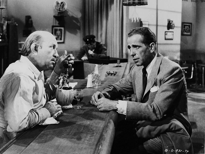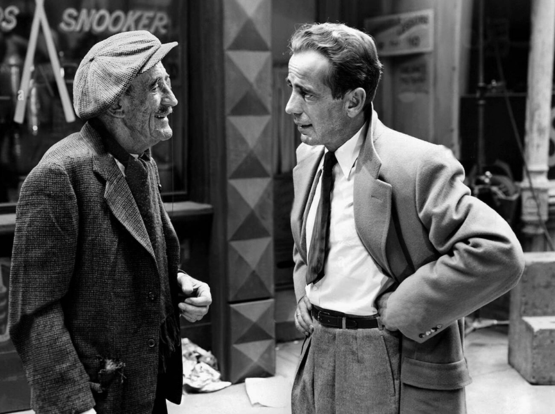 Smoking blanc, œillet à la boutonnière et verre de whisky à la main, dans le cabaret de Casablanca (1942), il égrène des souvenirs douloureux : le film, un des plus populaires au monde, a fait de Humphrey Bogart l’incarnation du romanesque hollywoodien dans ce qu’il a de meilleur. Borsalino sur l’œil, trench-coat serré, Bogart se passe dubitativement le pouce sur la lèvre. Un genre (le film noir), une époque (les années 1940) pourraient se réduire à cette icône.