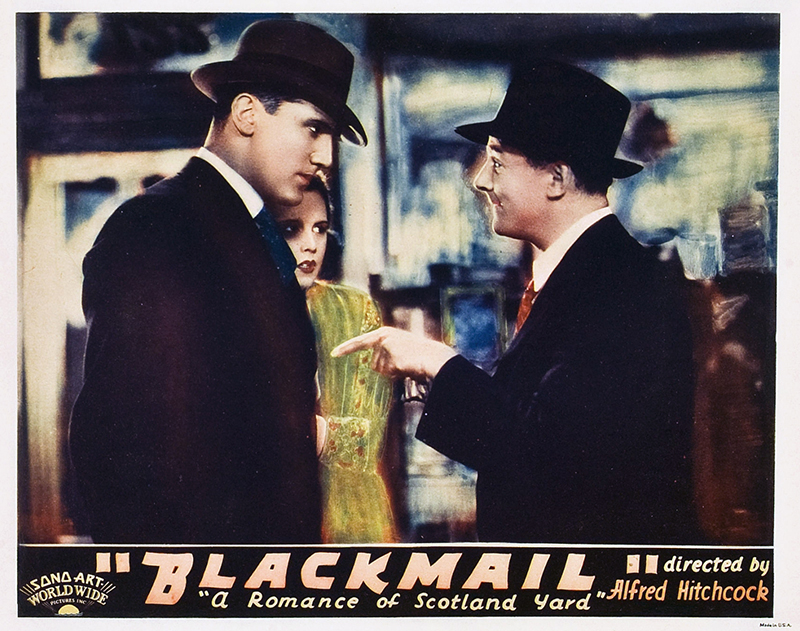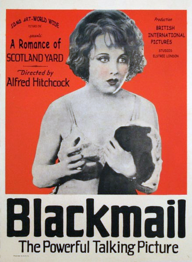 La première expérience parlante d’Hitchcock, ce sera Blackmail (Chantage, 1929). Aujourd’hui, cette œuvre conserve une authentique modernité. L’auteur y installe des personnages et des situations qui alimenteront ses films postérieurs : la femme coupable, le policier amoureux de la femme qu’il doit arrêter, l’union terrible par un secret encore plus terrible, l’itinéraire vécu par un couple et la traversée des apparences.
