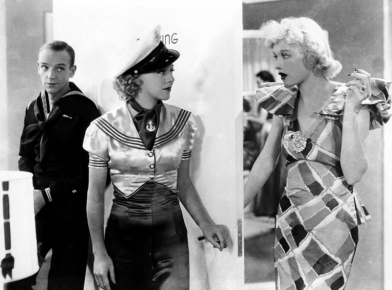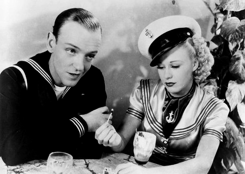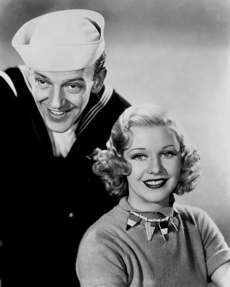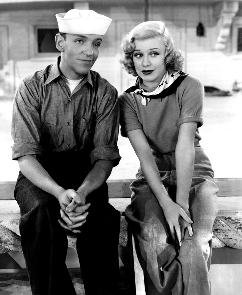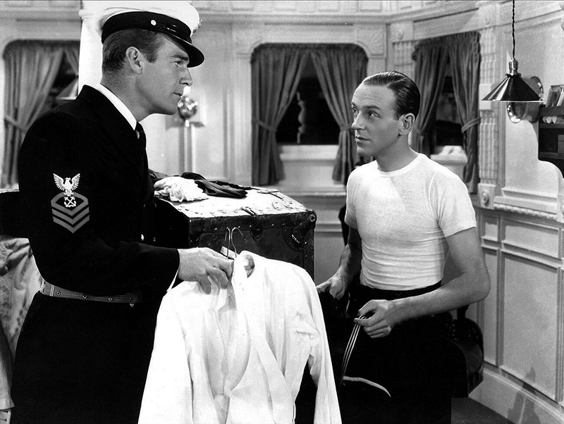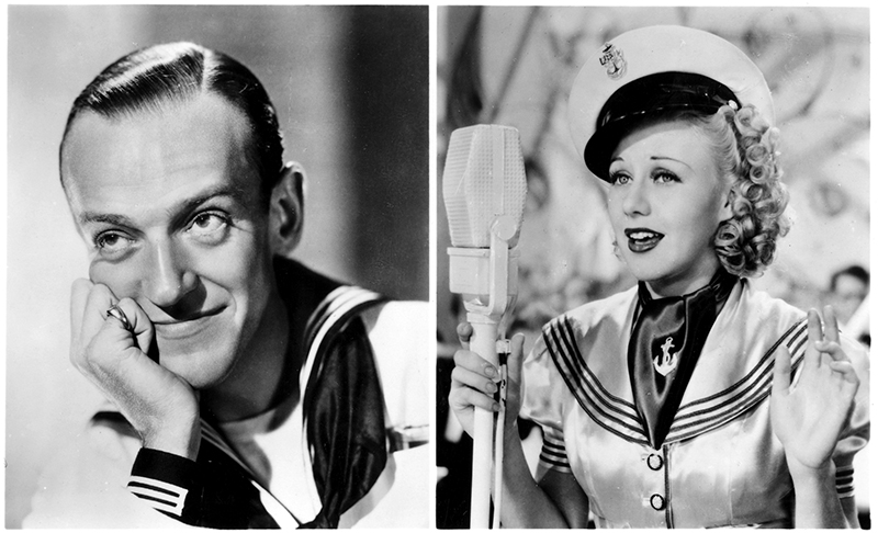 Bien qu’il vienne déjà d’écrire plusieurs « tubes » pour Top Hat, Irving Berlin se montre tout aussi inspiré pour la bande originale de Follow the Fleet. Ses mélodies entraînantes et ses paroles sophistiquées correspondent parfaitement au style d’Astaire et Rogers, et ces derniers prennent un plaisir évident à les interpréter – en particulier Let Yourself Go, chanté malicieusement par Ginger, I’m Putting all My Eggs in One Basket, qui donne lieu à un duo comique, et Let’s Face the Music and Dance, dont le tournage est émaillé par une nouvelle mésaventure causée par la robe choisie par Ginger. Cette fois, ce ne sont pas les plumes qui posent problème, comme sur le plateau de Top Hat, mais ses manches lourdement lestées. Lors de la première prise, l’une d’elles heurte violemment le visage d’Astaire, qui, un peu sonné, parvient tout de même à danser jusqu’au bout de ce long plan-séquence de deux minutes. Persuadé que la prise est ratée, l’acteur en fait tourner vingt -deux autres, mais c’est finalement la première qui figure dans le film. Astaire ne se formalisera pas outre mesure de cet incident – peut-être parce qu’il a lui-même blessé Randolph Scott en lui assénant un vrai coup de poing dans leur scène de bagarre… [Collection Comédies musicales – En suivant la flotte – Eric Quéméré (n°47)]