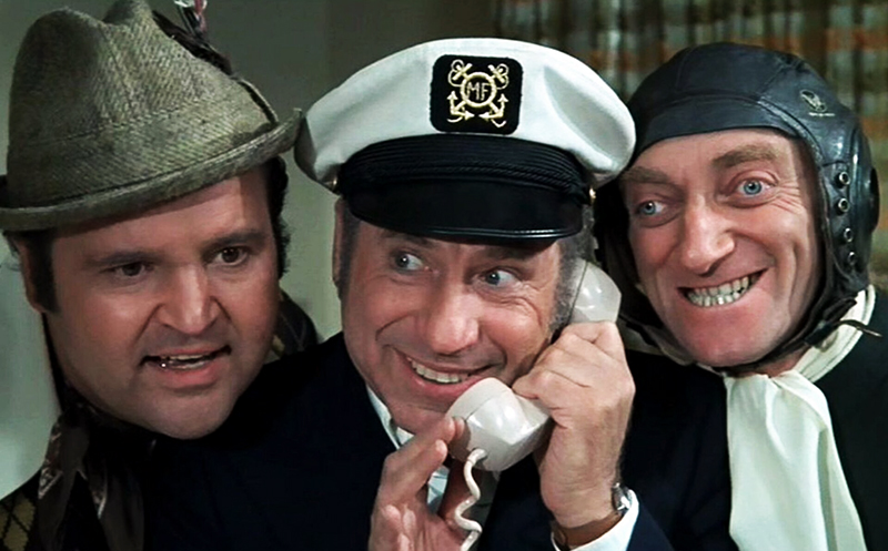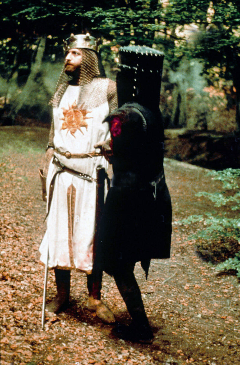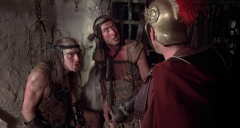 Seuls les Monty Python, venus de la télévision où ils s’étaient signalés par leur délire anarchiste avec une série intitulée Monty Python’s Flying Circus, ont réussi à s’imposer durablement au cinéma. Constitué de John Cleese, Graham Chapman, Michael Palin, Terry Jones, Eric Idle, Terry Gilliam et Neil Innes, ce groupe de redoutables farceurs, généralement formés dans les meilleures universités britanniques, a connu la gloire avec une transposition géniale des romans de la Table Ronde, Monty Python, sacré Graal ! (Monty Python and the Holy Grail, 1975), puis avec une désopilante et irrespectueuse parodie de l’Histoire sainte, Monty Python, la vie de Brian (Monty Python’s Life of Brian, 1979), qui eut de sérieux démêlés avec diverses églises et associations religieuses, très choquées, entre autres, par le chœur final des crucifiés du mont des Oliviers entonnant « Il faut prendre la vie du bon côté ». En 1983, les Monty Python ont même manqué de peu la Palme d’Or du Festival de Cannes, que les jurés furent très tenté d’attribuer à l’explosif Monty Python, le sen de la vie (Monty Python, the Maning of Life, 1983). [La grande histoire illustrée du 7ème art – Editions Atlas (1983)]