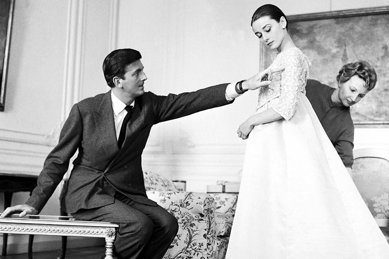 Audrey Hepburn en pleine séance d’essayage avec Hubert de Givenchy, en 1958 à Paris
