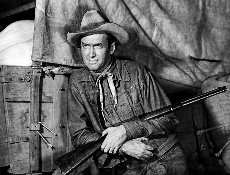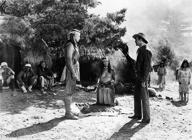Inaugurant brillamment la décennie, 1950 sera une année faste pour le western. A commencer par le maitre John Ford, qui signe le dernier volet de sa trilogie sur la cavalerie, Rio Grande, ainsi que le chef-d’œuvre d’humour et d’émotion qu’est Le Convoi des braves (Wagonmaster), où l’on retrouve presque tous les acteurs préférés du metteur en scène de Ward Bond à Russel Simpson, de Jane Darwell à Ben Johnson et Harry Carey Jr. La même année, Henry King réalise un de ses films les plus intéressants, La Cible humaine western tourné en noir et blanc avec un budget relativement modeste, qui reste sans doute la meilleure variation sur le thème du tueur (Gregory Peck) incapable d’échapper à son propre passé et à son destin tragique. Toujours en 1950, deux futurs maîtres du genre font de brillants débuts dans le western. Anthony Mann, pour sa part, signe trois films au cours de cette seule année : La Porte du diable (Devil’s Doorway) pour la MGM, avec un Robert Taylor étonnant dans le rôle d’un Indien luttant pour la dignité de son peuple, Les Furies (The Furies) pour la Paramount, avec Barbara Stanwyck et Walter Huston, et Winchester 73 pour l’Universal, le premier film du cycle interprété par James Stewart. La Flèche brisée, de Delmer Daves, apparaît comme un plaidoyer méritoire en faveur du peuple indien, avec James Stewart en éclaireur blanc amoureux d’une Indienne (Debra Paget), face à Jeff Chandler dans le rôle de Cochise. L’année suivante, William Wellman traitera le même thème avec beaucoup plus d’originalité dans Au-delà du Missouri, qui sera malheureusement distribué dans une version mutilée.